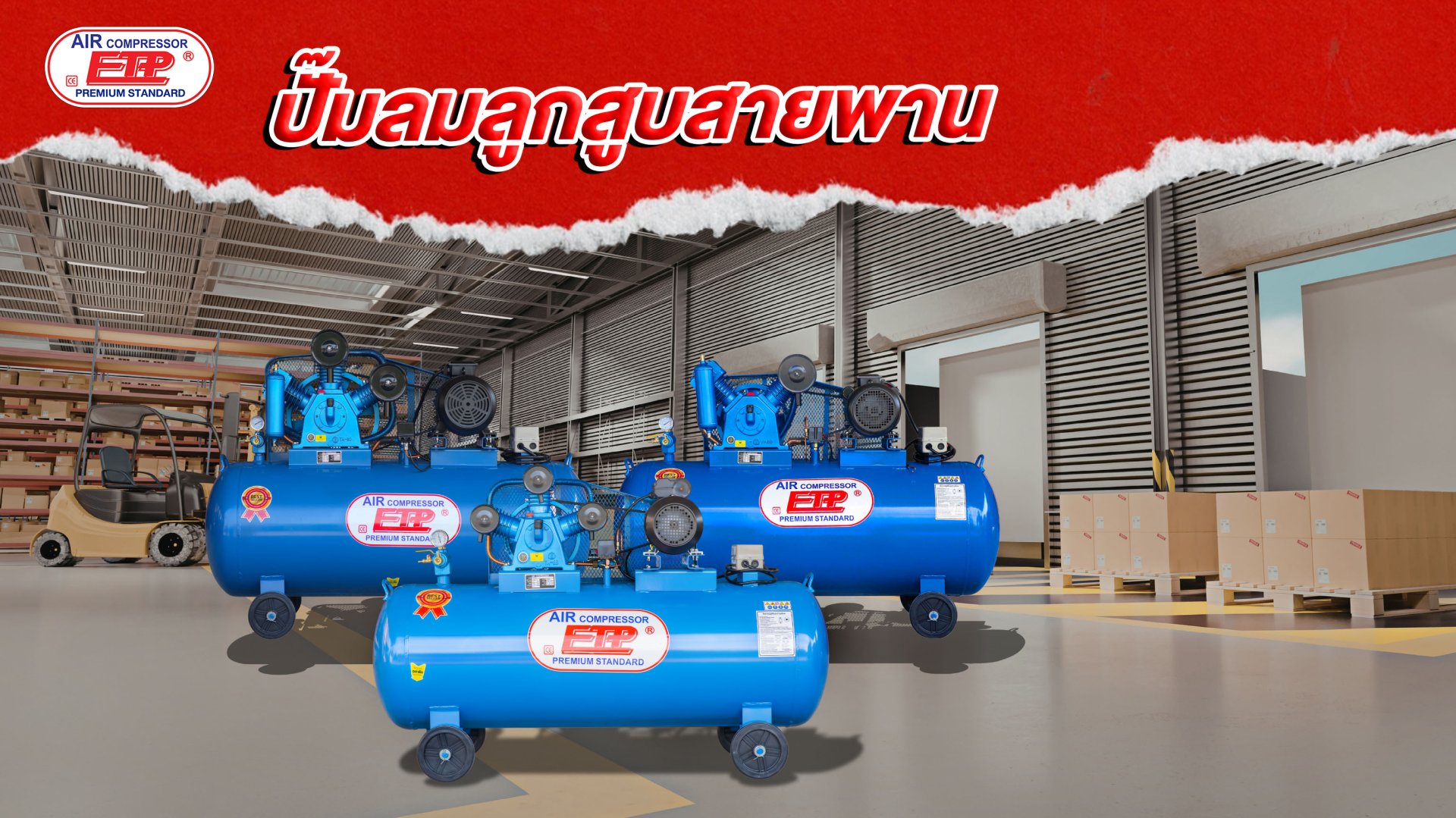 - ETP Air Compressor Model : HTA-80 /380 - ปั๊มลมแบบลูกสูบ 3 สูบ - แรงดันลมที่ใช้ได้ 16 บาร์ - อัตราการผลิตลม 575 ลิตร/นาที - มอเตอร์รอบเร็ว 7.5 แรง - ไฟฟ้า 220 , 380 โวลต์ - ถังลมขนาด 380 ลิตร - ระบบตัดต่ออัตโนมัติ ควบคุมด้วยเพรสเชอร์สวิทซ์ - รับประกันหัวปั๊ม 1 ปี